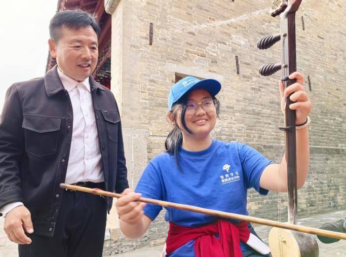 走进会馆东北角,国家二级演奏员秦岩正在教前来研学游的学生们学习板胡和四弦演奏。悠扬的琴声在会馆内回荡,孩子们认真学习指法和节奏,不时有同学尝试独立演奏,引得掌声阵阵。屋内,身段唱腔课老师李月英则在展示戏曲身段的走法。孩子们跟着老师的示范,学习兰花指、云手、圆场等基本动作,一招一式虽显稚嫩,但认真劲儿十足。