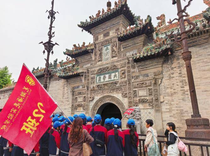 “花戏楼的铁旗杆16米长,每根重1.2万多斤,相当于孙悟空的金箍棒那么重了!”来到花戏楼景区,讲解员杨晴生动有趣的介绍迅速引起了孩子们的兴趣。同学们抬头仰望那高耸入云的铁旗杆,不禁发出阵阵惊叹。16米的巨大铁旗杆巍然矗立,历经数百年风雨依然挺拔,让孩子们真切感受到了古代工匠的智慧与匠心。